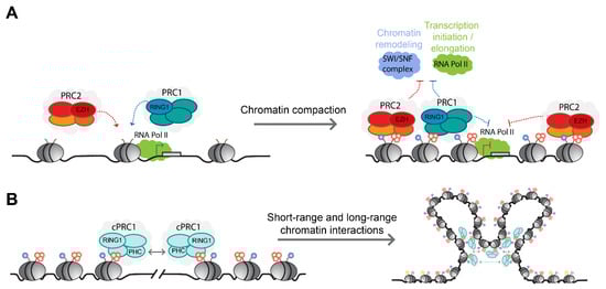 The importance of the H3K27me3 mark for polycomb-mediated transcriptional repression was demonstrated using fly genetics. Pengelly and colleagues elegantly showed that Drosophila, harboring a point mutation in histone H3, which prevents PRC2-mediated methylation in histone H3 lysine 27, fails to repress PRC2-dependent genes []. Moreover, the mutant histone H3 cells recapitulated the homeotic transformations observed in mutant fly cells harboring a catalytic-inactive E(z) mutant (EZH2 orthologue), highlighting the importance of H3K27me3 for polycomb-mediated transcriptional repression []. At the molecular level, H3K27me3 deposition antagonizes the activating histone acetylation modification on histone H3 lysine 27 (H3K27ac) and interferes with the recruitment and activity of RNA polymerase II [,] (Figure 3A). Furthermore, H3K27me3 can facilitate the recruitment of cPRC1 to mediate repressive long-range chromatin interactions [,,,,]. However, while cooperation between PRC1 and PRC2 ensures transcriptional repression of multiple polycomb target genes, PRC2-independent repression by PRC1 has been reported in several systems [,,,,]. Finally, H3K27me3 deposited on parental nucleosomes is recognized by EED reader activity and enables the spreading of the mark by PRC2 to adjacent nucleosomes to facilitate the propagation of polycomb domains over large genomic distances [,]. The propagation of H3K27me3 during DNA replication from parental nucleosomes to daughter chromatin during DNA replication also enables the restoration of the epigenetic signature onto newly blank histones, thus maintaining a cellular memory of polycomb-mediated transcriptional repression throughout mitotic divisions [,,,].