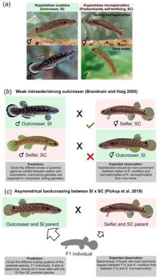Mangrove killifish species and schematic representation of predictions and expected observations. (a) Mangrove killifish species with respective mating systems. Mating system classifications for Kryptolebias ocellatus and K. hermaphroditus mating were retrieved from [33,35], respectively. ‘SI’ refers to self-incompatible. ‘SC’ denotes self-compatible. (b) Representation for the weak inbreeder, strong outcrosser hypothesis (WISO) [11]. This hypothesis predicts that outcrossers have higher potential for genome conflict given the higher likelihood of crossing between divergent genomes when compared to selfers. This higher potential for genome conflict should reflect on the level of gametes competitiveness with outcrossers gametes being able ‘overpower’ selfers gametes [11]. Thus, the prediction is that hybridization between species with different mating systems should occur more often between males of the outcrossing species with hermaphrodites of selfers (as competitive sperm should overcome the potential reproductive barrier imposed by the less competitive selfers eggs). The opposite direction is less likely to happen as outcrossers’ eggs should impose a stronger barrier for the less competitive sperm from selfers. (c) Representation for asymmetrical backcrossing between SI and SC hypothesis [5]. Given the differences between parental mating systems, if F1 individuals are viable and able to backcross, the direction of backcrossing should be biased towards the SI parent (higher gametes transmission) rather than the SC (gametes partially fertilized through selfing) parent.