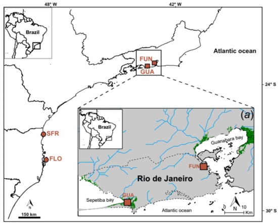 We analyzed two different genetic datasets. First, we analyzed microsatellite data for 103 K. ocellatus individuals (all from two previous datasets collected either in 2017 [33] or 2007 [40]) and 42 K. hermaphroditus individuals (32 sampled in 2017 and genotyped in this study; 10 sampled in 2007 [40]) from four localities in south and southeast Brazil (Figure 2; Table 1). The species are sympatric in two of those locations, Guaratiba and Fundão (GUA and FUN respectively in Figure 2), at the west and east limits, respectively, of the Rio de Janeiro municipality in Brazil [32,33]. The other two localities (SFR and GUA in Figure 2) represent an area only inhabited by K. ocellatus. Sampling was carried out under license ICMBio/SISBIO 57145-1/2017. Fish species were identified morphologically and confirmed by cytochrome oxidase subunit I (cox1) barcoding [33]. For the newly sampled material (K. hermaphroditus sampled in 2017; Table 1) we used a set of 16 microsatellites from Mackiewicz, et al. [44]. Micro-checker v. 2.2 (van Oosterhout et al. 2004) was used to check for errors or presence of null alleles. FSTAT v. 2.9.3.2 [45] was used retrieve basic statistics from microsatellite data, which are provided in Supplementary Table S2.