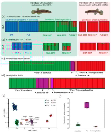 Both microsatellite genotypes and SNPs confirmed the hybridization between the outcrossing and SI K. ocellatus and the predominantly selfing SC K. hermaphroditus in two hybrid zones (FUN and GUA in Figure 2) in Southeast Brazil (Figure 3).