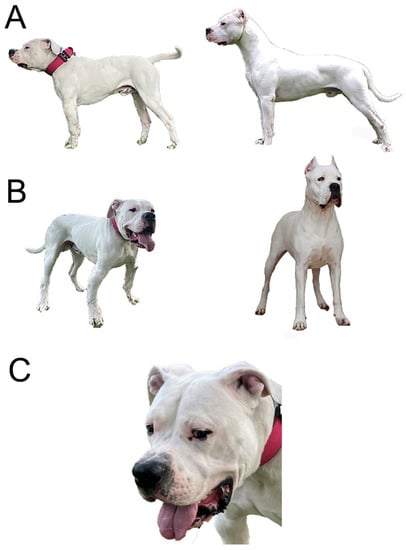 Morphology of the male affected dog at 2 years of age. The case subject (on the left) and a typical Dogo Argentino (on the right) according to the Federation Cynologique Internationale (FCI) standard. Please note that the affected dog had already undergone surgical corrections of the forelimbs before the photos were taken. (A) Side view: The height at withers of the case subject is 58.5 cm compared to the breed standard of 60–68 cm (ideal height 64–65 cm). The body length in the affected dog is also shorter. (B) View from a 45-degree angle: Disproportionally large head and forelimb angular abnormalities are evident. (C) Pronounced vertical groove between the eyes in the affected dog.