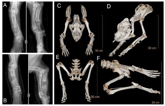 Radiological findings in the affected male dog. (A) Orthogonal radiographs of the frontal (left) and sagittal plane (right) of the right forelimb at 3 months of age. Angular deformities represented by shortening of ulna and subsequent bending of the radio causing incongruity of the elbow joint and carpus valgus. (B) Radiographs taken after surgical correction at 4 months of age. Evidence of the corrective surgery including ulnar ostectomy in mid diaphysis and presence of plates and screws to close the growth plates of the radius. (C–F) Total-body computed tomography at 2 years of age. Three-dimensional multiplanar reconstruction images highlighting the morphology of (C,D) skull and forelimbs, and (E,F) hindlimbs.