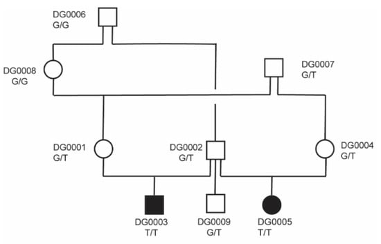 Pedigree of the investigated Dogo Argentino family. Filled and open symbols represent affected and unaffected dogs, respectively. Squares represent males, and circles females. Laboratory identifiers and genotypes at the PRKG2:c.1634+1G>T variant are indicated for all dogs.
