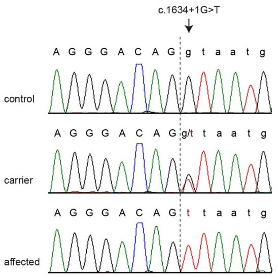 Representative Sanger electropherograms of a control, a carrier, and an affected dog illustrate the PRKG2:c.1634+1G>T variant. The vertical dashed line indicates the exon/intron boundary.