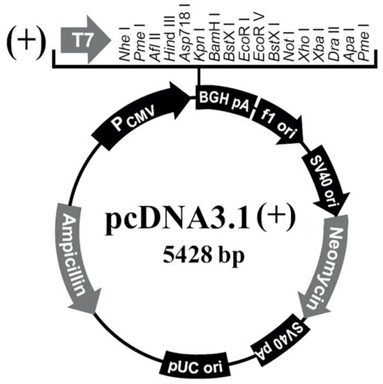 The pcDNA3.1(+) plasmid (Figure 2) (Youbio, Changsha, China) was digested with restriction enzymes Hind III and Xho I (Takara, Kusatsu, Shiga, Japan), and digested at 37 °C for 30 min. The digestion system is shown in Table 2. MiniBEST Agarose Gel DNA Extraction Kit (Takara, Kusatsu, Shiga, Japan) was used to digest the restricted product to obtain linear Hind III-Xho I CUT pcDNA3.1(+) vector. Finally, we measured the concentration and store the vector at −20 °C.