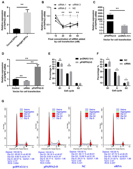 PAPPA2 was involved in the regulation of DPCs proliferation in Hu sheep. Note: (A): Relative expression of PAPPA2 mRNA in straight and curved dermal papilla cells (DPCs). (B): Relative expression of PAPPA2 after transfection with different concentrations of PAPPA2 siRNA-1/2/3 (with NC as control). (C): Relative expression of PAPPA2 after pPAPPA2-O transfection (with pcDNA3.1(+) as control). (D): PAPPA2 regulate the mRNA expression of insulin-like growth factor binding protein-5 (IGFBP5). (E,F) show the cell cycle statistics of DPCs after PAPPA2 overexpression (transfected with pPAPPA2-O) and interference (transfected with siRNA-1/2/3). The Transfections of pcDNA3.1(+) and NC were used as controls for overexpression and interference, respectively. (G): The results of cell cycle analysis by ModFit3.1. “*” indicates significant difference (p < 0.05) and “**” highly significant difference (p < 0.01).