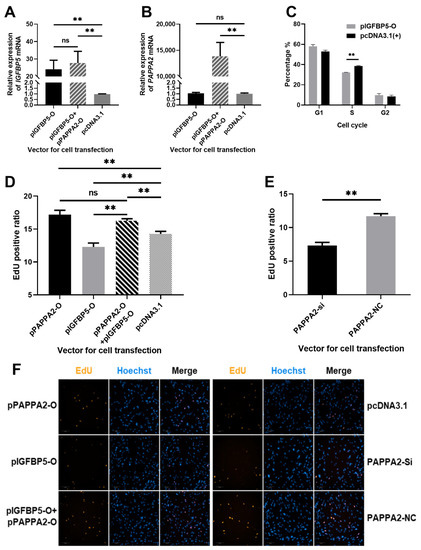 Effect of PAPPA2 and IGFBP5 on the proliferation of DPCs. Note: (A): Relative expression of IGFBP5 after transfection of pIGFBP5-O, pIGFBP5-O+pPAPPA2-O and pcDNA3.1 in DPCs. (B): Relative expression of PAPPA2 after transfection of pIGFBP5-O, pIGFBP5-O+pPAPPA2-O and pcDNA3.1 in DPCs, respectively. (C): Effect of IGFBP5 on the cycle of DPCs. (D): Proportion of EdU-positive cells after transfection with pIGFBP5-O, pPAPPA2-O, pIGFBP5-O+pPAPPA2-O and pcDNA3.1 in DPCs, respectively. (E): Proportion of EdU-positive cells after transfection with siRNA-2 and siRNA-NC of PAPPA2 in DPCs, respectively. (F): Fluorescence photos of EdU staining results in each group (200×). In this figure, “**” highly significant difference (p < 0.01) and “ns” indicates non-significant difference.