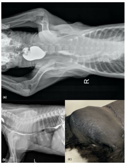 Clinical features showing chest radiographs and hematomas in a Newfoundland–Parti Standard Poodle hybrid puppy with hemophilia B: Case #1. Radiographic views of ventrodorsal (a) and lateral (b) thorax after a bolus of barium suspension showing tracheal and esophageal displacement at the time of admission (Day 1). Photograph of left chest wall post-surgery on Day 10 showing a large subcutaneous hematoma (c).