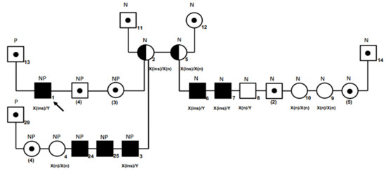 Pedigree of a hemophiliac Newfoundland–Parti Standard Poodle family, with results of genotyping and aPTT results. Squares and circles represent males and females, respectively. Filled symbols indicate clinically bleeding male dogs hemizygous for the F9 variant and/or having a prolonged aPTT. All affected animals displayed abnormal bleeding. Half-filled symbols indicate females who are carrier of the F9 variant. The black arrow refers to the index case (Case #1). Symbols with a dot but with numbers in brackets indicate number of dogs that were not available for genotyping. The six male offspring in this category had normal aPTTs (squares with dot). Genotyping results are shown below each square or circle (X and Y represent the X- and Y-chromosomes; (n), wild-type; (ins), insertion (NM_001003323.2:c.821_822insA [15]). Abbreviations: N, purebred Newfoundland dog; NP, Newfoundland–Parti Standard Poodle: P, Standard Poodle.