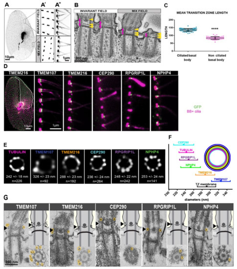 - Tassin, A.-M.; Lemullois, M.; Aubusson-Fleury, A. Paramecium tetruarelia basal body structure. Cilia 2016, 5, 6. [Google Scholar] [CrossRef] [PubMed]