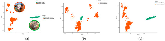 - Mizeranschi, A.E.; Neamț, R.I.; Mihali, C.V.; Goilean, V.; Carabaş, M.; Ilie, D.E. Comparative Analysis of Romanian and Swiss Bovine Populations Using Whole Genome Sequencing and SNP Microarrays. Sci. Pap. Anim. Sci. Biotechnol. 2020, 53, 93–99. [Google Scholar]