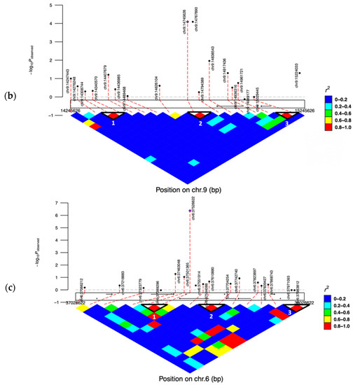 3.5. Linkage Disequilibrium (LD) Blocks of the Significant SNPs