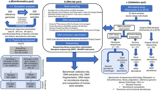 In addition, we conducted multiple wet-lab experiments to establish an optimized preanalytical protocol, from stool collection and DNA extraction and fragmentation to end-repair steps (Figure 1b). Finally, we validated our protocol and pipeline using human stool samples sequenced with different technologies (ONT, Illumina, and SOLiD) (Figure 1c).