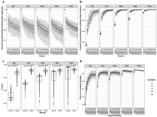 Thus, we next explored the mapping quality score (mapQ) as a parameter for filtering ONT sequence alignments. MapQ, as computed by minimap2, assigns high values to long reads and for which the scores assigned to secondary alignments were weak when compared with primary alignments [29]. A total of 11 different mapQ thresholds (from 0 to 50 at steps of 5) were evaluated based on the primary alignment of simulated datasets (Supplemental Figure S2). In terms of recall in species richness estimates, we observed a similar decrease with the stringency of the mapQ threshold as observed with the alignment identity, although reaching overall higher recall values for the ensemble of simulated data (Figure 3a; mean recall ± standard deviation = 0.826 ± 0.053 vs. 0.816 ± 0.237 for mapQ filtering vs. alignment identity filtering, respectively). Similar results were observed for precision, which increases with the stringency of the mapQ threshold reaching overall high values for the ensemble of simulated data (Figure 3b; mean precision standard deviation = 0.95 ± 0.089 vs. 0.65 ± 0.24 for mapQ filtering vs. alignment identity filtering, respectively). When both filtering strategies were compared in terms of F1 scores, defined as the harmonic mean of precision and recall (high F1 scores being a good trade-off between the two metrics [37]), we observed that the filtering by mapQ produces significantly higher F1 scores than filtering by alignment identity under all community compositions regarding species richness (Figure 3c; p-value < 0.05; Wilcoxon rank-sum test).