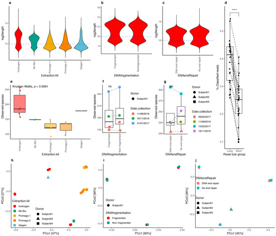 DNA extraction kits, fragmentation, and end-repair impact on human stool metagenomic composition from ONT sequencing data. Read length distributions of ONT reads across different DNA extraction kits ((a) n = 29) and between DNA fragmentation ((b) n = 6 paired samples fragmented/nonfragmented) and DNA end repair ((c) n = 6 paired samples end vs. no end repair) steps for Invitrogen samples. Blue dashed lines correspond to the median value of log2-transformed read lengths used to stratify reads as long or short. (d) Differences between the fraction of classified reads by the Centrifuge approach between long and short reads for 29 samples in panel (a). (e) Differences in microbial diversity (observed species) between extraction kits (n = 29). (f) Differences in microbial diversity (observed species) by DNA fragmentation (n = 4 paired samples). (g) Differences in microbial diversity (observed species) by DNA end-repair step (n = 4 paired samples). (h) PCoA ordination of 29 samples in panel (a) colored by extraction kit. (i) PCoA ordination of 8 samples in panel (f). (j) PCoA of 8 samples of panel (g) colored by DNA end-repair step. ns (panel (f,g)) = nonsignificant differences in paired Wilcoxon rank-sum tests. **** = p-value < 0.0001 in paired Wilcoxon rank-sum test.