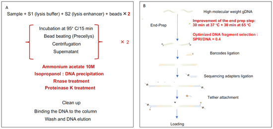 Optimization of DNA extraction and library preparation protocols. (A) Steps of the bacterial DNA extraction protocol. In black, the steps include the protocol of the Invitrogen kit, in red, the improvement steps recommended by the IHMS consortium. (B) Improvement of library preparation by the application of NEB recommendation and decrease in the SPRI/DNA ratio.