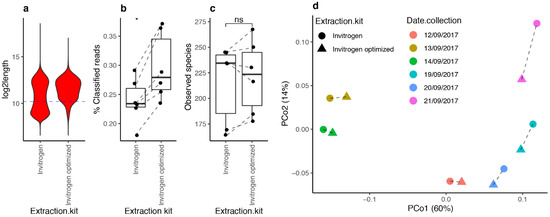 The read length was also improved (Figure 6a). The standard Invitrogen protocol produced two populations of reads with average read lengths of 500 and 6000 bp, while the optimized protocol produced a single read population with an average read length of 6000 bp. According to this, we observed a significant increase in the fraction of classified reads in comparison with the fraction obtained with the initial protocol recommended by Invitrogen (Figure 6b; 29.72% with optimized protocol vs. 23.92% with original protocol; p-value = 0.031, Wilcoxon signed-rank test). We observed an increased microbial diversity (observed species) in four of the six samples with the optimized protocol even if this variation remains insignificant (p-value = 0.31; Wilcoxon signed-rank test) (Figure 6c). Finally, PCoA (Figure 6d) showed that differences in microbiome composition across samples are explained mainly by the collection date of the samples (R2 = 0.89, p-value = 0.001, PERMANOVA test), with no significant effect of the extraction kit on the overall microbiome composition (R2 = 0.026, p-value = 0.906, PERMANOVA test). Altogether, the optimized DNA extraction protocol exhibited a better DNA yield and purity, longer sequences than the usual protocol, leading to a significant yield improvement (fraction of classified reads) of the taxonomic binning with no impact on the overall microbiome composition of the samples.
