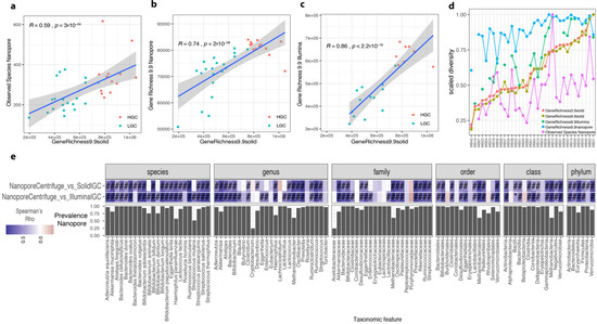 We observed significant positive associations between Centrifuge-based diversity estimates from ONT sequencing and the reference gene richness from SOLiD sequencing based on the IGC (Spearman rho = 0.59, p-value = 3 × 10−4 for observed species based on Centrifuge results; Figure 7a). These similarities increased with the use of the IGC as reference database for diversity estimations (Spearman rho = 0.74, p-value = 2 × 10−6 for gene richness based on ONT read mapping over the IGC; Figure 7b). However, the similarity was higher with gene richness estimates based on Illumina sequencing despite differences in library preparation (Spearman rho = 0.86, p-value < 2.2 × 10−6; Figure 7c). When we integrated the scaled diversity profiles (dividing each diversity estimate by the maximum value in each sequencing source for these 33 samples (ranges from 0 to 1)) and ordered them based on the reference gene richness in the original publication [8], we observed that DNA extraction had an impact on diversity. Both ONT and Illumina sequencing using the same DNA extraction method showed similar variations in microbial diversity estimates compared with the reference SOLiD data (Figure 7d). This included a switch in the sample showing the highest diversity (i.e., MB12 sample with Illumina and ONT sequencing, MB21 sample with SOLiD sequencing; Figure 7d).