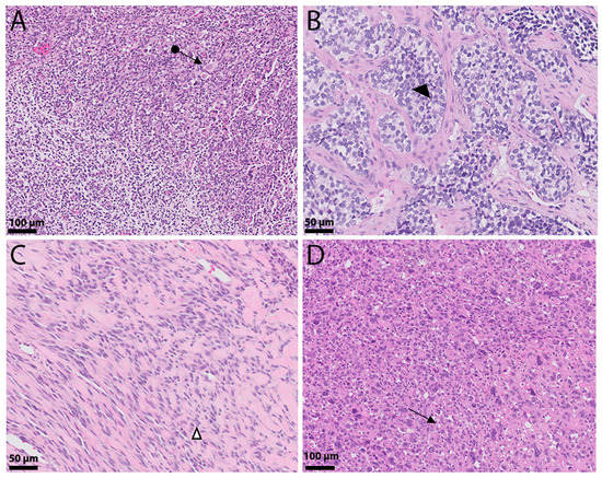 Lastly, pleomorphic rhabdomyosarcoma is an uncommon variant, most often presenting in adults older than the age of 45 [24,25,26,27]. This tumor is distinguished by loosely arranged, large, round or pleomorphic cells with hyperchromatic nuclei and prominently eosinophilic cytoplasm (Figure 1D). While morphologically, it may be difficult to distinguish from undifferentiated pleomorphic sarcoma, these tumors typically display strong and diffuse desmin expression with occasional co-expression of MyoD1 and myogenin.