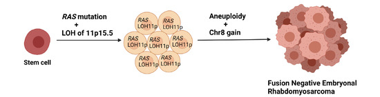 Although ERMS can be associated with syndromes, such as neurofibromatosis 1 (NF1), Costello [36], Noonan or Li-Fraumeni syndrome, or as part of the DICER1 syndrome [29], sporadic cases are much more common. Interestingly, while ARMS are most commonly near-tetraploid, 68% of ERMS exhibit hyperdiploid profiles [37]. These tumors will frequently show whole-chromosome gains, in particular, polysomy 8 [30,34,38,39,40,41], which has been seen in other cancers, such as Burkitt lymphoma [42] or solid tumors, including desmoid fibromatosis [43] and lipoblastoma [44,45], but also gains of chromosomes 2, 11, 12, 13 and/or 20 have been seen in ERMS. Additionally, FN-RMS can show loss of heterozygosity at Chr11p15.5 [46,47] (Figure 2), which has also been seen in Wilms tumor or hepatoblastoma associated with Beckwith–Wiedemann syndrome [48,49]. This locus contains imprinted genes encoding for IGF2 and other genes, such as CDKN1C, with IGF2 overexpression being an almost universal phenomenon [47]. Another fairly common copy number change is the low level amplification of MDM2 [50].