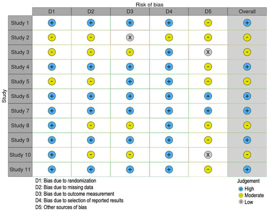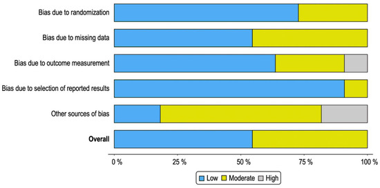 - McGuinness, L.A.; Higgins, J.P.T. Risk-of-bias VISualization (robvis): An R package and Shiny web app for visualizing risk-of-bias assessments. Res. Synth. Methods 2021, 12, 55–61. [Google Scholar] [CrossRef]