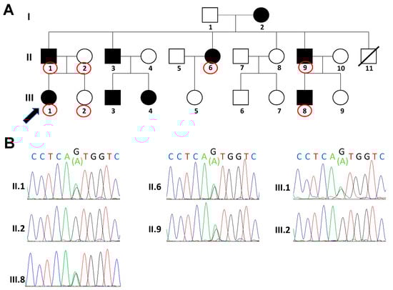 (A) Family pedigree of the patient and her relatives. Affected individuals are shown as filled symbols, whereas the patient is identified by the arrow. Family members analysed for KRT5 pathogenic variant are indicated by red circles. (B) Sequence electropherograms of KRT5 exon 5 region containing the G > A transition (c.967 G > A) (pVal323Met). The pathogenic variant is present in affected family members only.