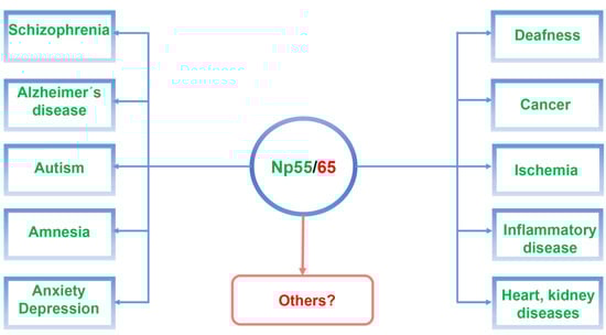 Schematic illustration of neuroplastin Np55/65 as a central component related to neuropsychiatric and neurodegenerative diseases as well as in other diseases associated with neuroplastin malfunctions.