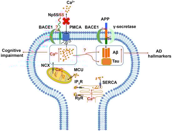 An alteration of neuroplastin expression in AD patients was reported recently []. In the early phase of confirmed AD neuropathology, neuroplastin was significantly upregulated in the hippocampus (dentate gyrus, CA2/3 region, and subiculum) without changes in neuron number or tissue volume. Interestingly, patients experiencing a longer duration of AD disease (5–7 years) showed a decreased expression level of neuroplastin compared to patients with a short duration AD (≤4 years), which may indicate a role of neuroplastin in the early phase of AD. The analysis of neuropathological amyloid plaques and neurofibrillary tangles (NFT) showed a negative correlation between neuroplastin expression level and the number of amyloid plaques in the CA1 area and a weak negative correlation between neuroplastin and NFT in CA1, CA2/3, and subiculum. In human brain, both NPTN and PMCAs exhibit similar expression patterns at the transcriptomic level []. In comparison to the aging brain, the expression and activity of PMCA in AD patients were reduced, and the AD hallmarks tau and Aβ showed a negative impact on PMCA activity, which may indicate an altered Ca2+ homeostasis in the AD brain [,,]. Alternatively, Ca2+ dys-homeostasis could promote the accumulation of Aβ and phosphorylated tau protein, which result in the neuropathy and brain function deficits in AD patients [,,]. Aβ is produced by the β- and γ-secretase cleavages of the amyloid precursor protein (APP) []. The principal β-secretase for generation of Aβ in vivo is the β-site APP cleaving enzyme 1 (BACE1) [,]. The use of BACE1-specific inhibitors has been proposed as a potential intervention in AD []; however, this approach must be regarded carefully, as BACE1 cleaves numerous substrates. Interestingly, both neuroplastin and basigin were identified as potential BACE1 substrates [,]. Although further studies on the cleavage of Np by BACE1 were not conducted, an attractive hypothesis is that increased neuroplastin cleavage by BACE1 could result in the cognitive deficits observed in AD (Figure 3).