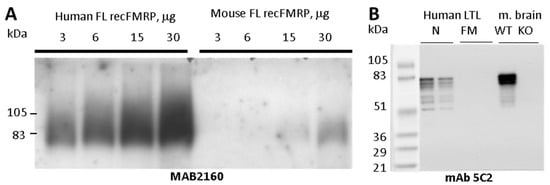 FMRP immunogen characterization and anti-FMRP mAb5C2 immuno-reactivity. (A) Purified recombinant full length (FL) human and mouse FMRP loaded at 3, 6, 15, or 30 μg per lane and resolved on 4–15% Criterion Tris-HCl gel and blotted with MAB2160 (clone 1C3). (B) mAb5C2 WB analysis of human LTL lysates from normal (N) and full mutation (FM) FMR1 genotype males (30 and 15 μg per lane per genotype) and mouse brain lysates from a wild type (WT) and Fmr1 KO mouse (KO) 15 μg each.