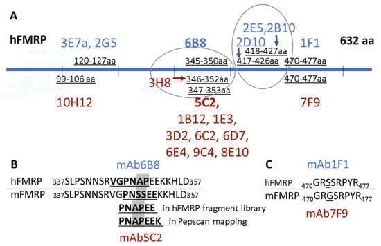 Schematic map of the anti-FMRP mAb epitopes. The epitopes for mAb clones are shown in (A) with anti- hFMRP mAbs shown above the schematic view of the protein in blue and anti-mFMRP mAb clones shown below in red. Magnified sequence of super immunogenic region and epitopes of mAb5C2 and mAb6B8 (B) and mAb1F1 and mAb7F9 (C).