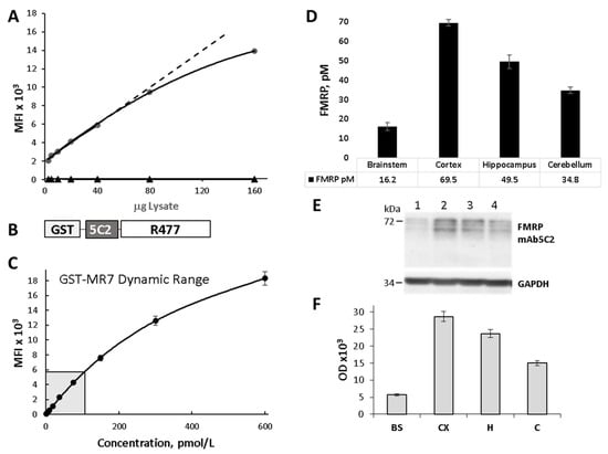 Our laboratory previously developed a Luminex-based capture immunoassay, qFMRP, that accurately quantifies FMRP using the human-specific mAb6B8 (available through Biolegend, San Diego, CA, USA) capturing antibody []. The mAb5C2 (available through Biolegend, San Diego, CA, USA) has high avidity for mouse FMRP and was successfully used for immunohistochemical characterization of FMRP expression in neurons and glia in mice [,]. We selected this antibody to establish a parallel Luminex-based immunoassay (qFMRPm) for quantification of FMRP in mouse-derived tissue samples. In the assay, we used mAb5C2-coupled microspheres to capture FMRP, which was followed by detection with the anti-FMRP rabbit antibody R477. First, we evaluated the capacity and specificity of the 5C2-R477 antibody pair to capture and detect endogenous FMRP in the immunoassay of whole brain homogenates from wild type (WT) and Fmr1 knockout (KO) mice. We used 2.5 to 160 μg of the total protein. The amount of FMRP detected in WT lysates was proportional to the amount of sample load (Figure 3A) and showed linearity up to 40 μg of lysate (R2 = 0.9945). The KO lysates had a background level of fluorescence in all wells irrespective of load up to 160 μg.