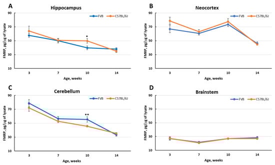 The absence of FMRP can lead to increased neuronal excitability and seizures, as some FXS patients exhibit seizures. FVB mice compared to C57BL/6J mice not only have a lower threshold for audiogenic seizures, but also have a lower threshold for experimentally induced SE. To further explore potential strain differences in the developmental expression of FMRP in the CNS, we used qFMRPm to determine the normal developmental expression of FMRP in the two strains. In an earlier study, mAb 5C2 was successfully used to immunohistochemically profile FMRP expression in the developing brain of C57BL mice [] at postnatal days 0, 10, and 20, and adults. In our assessment we analyzed four brain regions: the hippocampus, neocortex, cerebellum, and brainstem of C57BL/6J and FVB mice at 3, 7, 10, and 14 weeks of age. To eliminate a possible litter effect, we collected brain tissue from no more than two males per litter per time point. Surprisingly, the post hoc analysis of the data returned a non-significant difference in the CNS expression of FMRP between the two strains at 3 weeks of age across all examined structures (Figure 4), indicating that any difference in audiogenic or pilocarpine-induced seizure threshold reported between the two strains cannot be attributed to a difference in basal FMRP expression. However, we did observe a developmental decrease in FMRP expression in each of the structures examined, except for the brainstem (Figure 4).