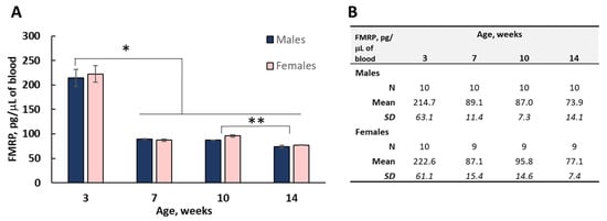 Quantitative assessment of FMRP in DBS extracts derived from C57BL/6J mice. A bar graph representation of the levels of FMRP detected in DBS extracts from male and female mice collected at 3, 7, 10, and 14 weeks of age is shown in (A). FMRP presented as gram per unit volume (10−12 g/mL) of whole blood as listed in part (B). FMRP levels detected in DBS of the 3 week old animals were significantly higher (* p < 0.001) compared to the data at 7, 10, and 14 weeks of age. FMRP expression in 14 week old mice vs. 10 week old mice was significantly lower in both sexes (** p < 0.05 for males and p < 0.01 for females). Error bars represent the SEM of the group.