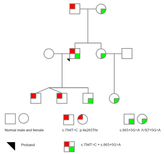 Sanger Sequencing and family analysis showed that the proband carried compound heterozygous variants: FX:NG_009258.1:g.29627T > C (Genomic description); NM_000504.3: c.794T > C(Transcript description); NP_000495.1:p.Ile265Thr(Protein description), a missense mutation, and FX:NM_000504.3 (c.865 + 5G > A: IVS7 + 5G > A), a splicing-site mutation. His father and elderly son carried the c.794T > C: p.Ile265Thr variant. His mother, sister, niece, and twin sons carried the c.865 + 5G > A: IVS7 + 5G > A variant. Figure 1 shows the family pedigree, and Figure 2 shows the sequencing analysis of the two variants found in the family. Besides, no other variants were found in F10 except a synonymous mutation c.792C > T.