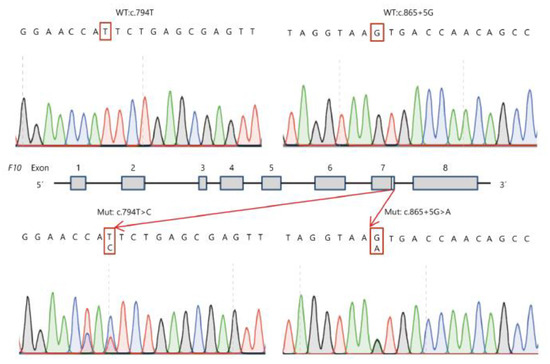 Varcards (http://varcards.biols.ac.cn/ (accessed on 30 April 2021) [24] was used To predict the pathogenicity of missense mutation c.794T > C in F10, which includes most commonly used predictive tools, such as SIFT, Polyphen-2, MutationTaster. NNSPLICE (https://www.frui-tfly.org/seq_tools/splice.html (accessed on 30 April 2021) and Netgene2 (http://www.cbs.dtu.dk/sevices/NetGene-2/output.php (accessed on 30 April 2021)) were used to predict the pathogenicity of splicing-site mutation c.865 + 5G > A. The species conservation of FX amino acid sequence is done in DNAMAN and presented with a picture in Pymol using the structure (PDB number 1c5m) in Protein Data Bank (http://www.rcsb.org (accessed on 30 April 2021).