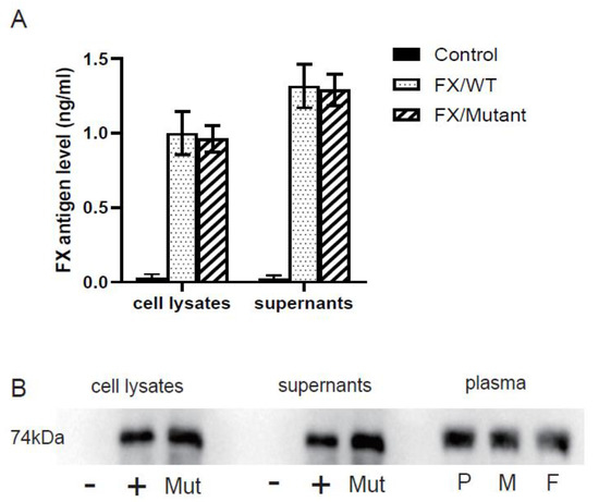 (A). FX antigen levels of the transfected cells in cell lysates and supernatants using ELISA. Data are derived from four independent measurements (SD). (B). Western Blot for the FX in transfected cell lysates and supernatants, as well in plasma of the proband and his parents. (-: control (empty vector); +: pcDNA3.1/FX WT; Mut: pcDNA3.1/FX Mut Thr265; P: Proband; M: Mother; F: Father).