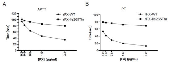 The clotting activities of both recombinant wild-type and the recombinant FX variant (rFX) were evaluated by both PT and aPTT assays using a Stago STA-R Evolution (Diagnostica Stago, Asnieres, France) as described. The clotting activities of samples in both assays were assessed at five different dilutions ranging from 0.2 to 3.2μg/mL FX (final concentrations).