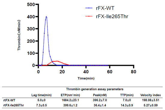 The procoagulant potential of recombinant FX variant. Thrombin generation assays of FX-WT(blue) and FX-Ile265Thr (red) in commercially available FX-deficient plasma using TECHNOTHROMBIN® TGA RC Low kit was measured for 60 min in 1 min intervals at 37 °C. Above is the graph of thrombin generation and below are the parameters of this assay. Data are derived from three independent measurements (SD).