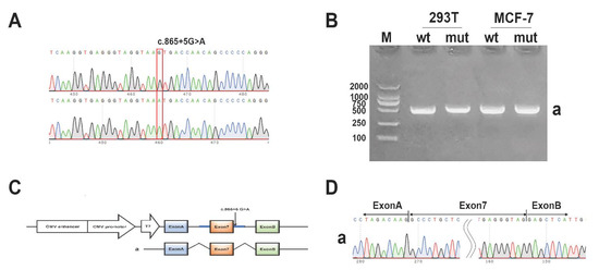 (A). Sequencing of the pcMINI-FX-WT and pcMINI-FX-Mut. (B). Agarose Gel Electrophoresis for the PCR products in 293T and MCF-7 cells (band a). (C). The construction method of the pcMINI-FX-WT/Mut and splicing mode. Modified pcDNA3.1 with double promoters(CMV promoter and T7 promoter) was used (Thermo Fisher Scientific KK) as vectors. The pcMINI-FX-WT/Mut contains exon7 and intron/exon boundaries, as well as exonA and exonB. ExonA and ExonB are sequences with strong splicing recognition used for splicing study before. (D). Sequencing of the PCR products using designed primers.