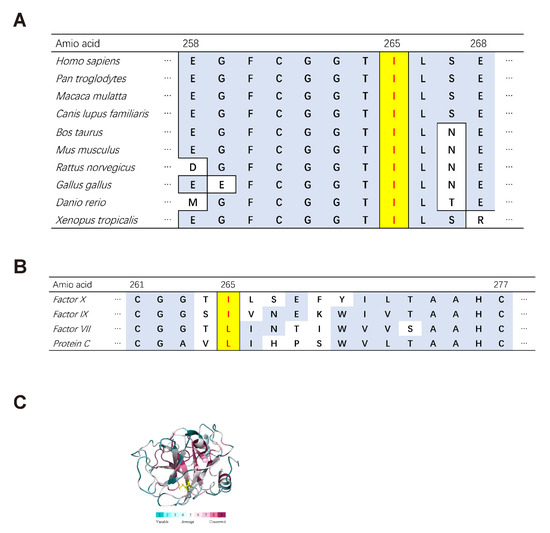 (A). Comparison of amino acid alignments around Ile265 among different species. (B). Comparison of amino acid alignments around Ile265 among FVII (Factor VII), FIX (Factor IX), PC (Protein C). (C). The position of Ile265 (the yellow sticks) in FX and conservation picture of the FX protein (heavy chain) using Pymol.