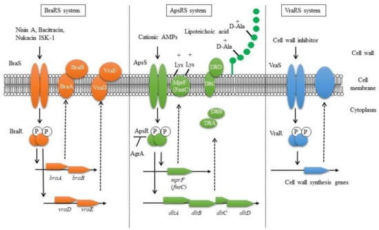 Three TCSs are known to be involved in bacteriocin resistance: BraRS, ApsRS, and VraRS. BraRS is a TCS that senses various bacteriocins and induces the expression of the ABC transporter vraDE. BraAB is required for BraS to sense bacteriocins, and braAB expression is also induced via BraRS (left). ApsRS is involved in resistance to positively charged antimicrobial peptides (AMPs). Aps controls the cell surface charge by regulating the expression of dlt and mprF. Aps is negatively controlled by Agr, the quorum sensing system (middle). VraRS is involved in resistance to cell wall synthesis inhibitors and regulates several genes in the cell wall synthesis system such as pbp2, sgtB, and murZ (right).