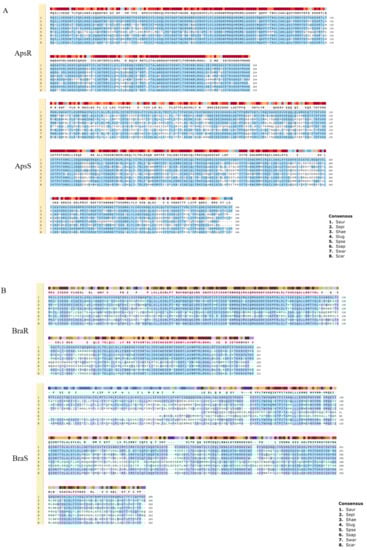 Figure 2. Comparison of two-component systems showing homology with ApsRS and BraRS of S. aureus among staphylococci. Alignment of ApsRS (A) of BraRS (B) among 8 staphylococcal species. 1. Staphylococcus aureus (Saur), 2. Staphylococcus epidermidis (Sepi), 3. Staphylococcus haemolyticus (Shae), 4. Staphylococcus lugdunensis (Slug), 5. Staphylococcus pseudintermedius (Spse), 6. Staphylococcus saprophyticus (Ssap), 7. Staphylococcus warneri (Swar), 8. Staphylococcus carnosus (Scar).