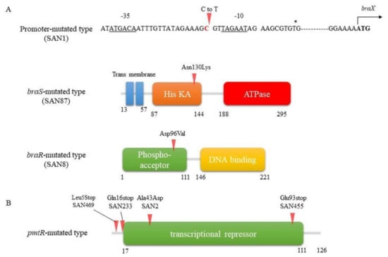 Some of the SAN strains showed constitutively high expression of vraDE, the expression of which is normally induced by nisin A. In contrast, no induction of vraDE expression was observed in the other SAN strains. By analyzing the sequences of vraDE and braRS, we found point mutations in the BraRS region of three strains with high VraDE expression (Figure 3A). These three strains, designated SAN1, SAN8, and SAN87, showed mutations in different genes in the braRS region [63].
