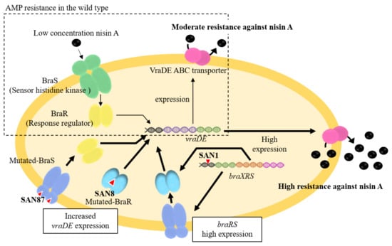 In addition to having high nisin A resistance, the mutants with BraRS mutations were also found to be highly resistant to bacitracin and gallidermin derived from Bacillus subtilis and Streptococcus agalactiae, respectively. Since the BraRS-VraDE system was originally involved in the acquisition of resistance to low concentration of these bacteriocins, this acquisition of high resistance was considered to be due to the high expression of VraDE.