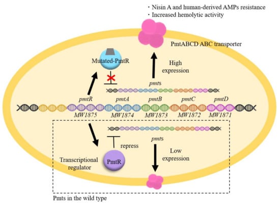 BraRS-VraDE-independent nisin A high resistant S. aureus was also isolated (SAN2, SAN233, SAN455, and SAN469) [64]. This mutant has a mutation in pmtR, which encodes a transcriptional regulator that controls the expression of the pmtR and pmtABCDD (pmtA-D) operon (Figure 3B). As a result, these mutants exhibited increased expression of PmtA-D, a transporter responsible for the export of PSMs. High nisin A-resistant mutants were also isolated from not only the MW2 strain but also the MRSA COL strain and TY34 strain. All these mutants had a point mutation in the pmtR gene, yielding a mutant PmtR with an amino acid replacement of alanine to aspartic acid (SAN2 from MW2) or a truncated PmtR (SAN469 from MW2, SAN233 from COL and SAN455 from TY34) (Figure 3B).