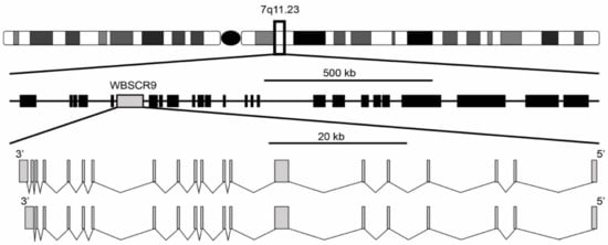 Genomic organization of WS deletion region including WBSCR9 gene. There are two isoforms of BAZ1B gene on DNA minus strand with either 19 or 20 exons.
