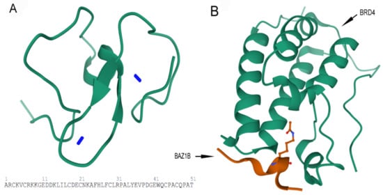 Images are obtained from the protein data bank. The structure information comes from primary publication []. (A) Tertiary structure of 51 residues in PHD zinc finger domain of BAZ1B with the two zinc ions (Zn2+) (blue sticks) are shown (residues 1185–1235). PDB ID: 1F62. (B) Crystal structure of first bromodomain of human BRD4 in a complex with an acetylated BAZ1B peptide (residues 217–226; FLPH(ALY)YDVKL; K221 ac). PDB ID: 5NNF.