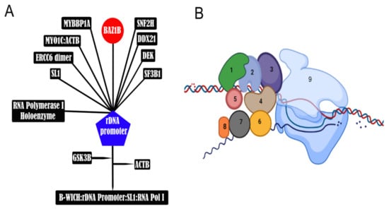 The B-WICH complex co-localizes with the RNA Pol-I complex via actin, and the interaction of actin with NM1 facilitates polymerase movement on permissive chromatin and improves 45S pre-rRNA expression. NM1 interaction with SNF2H and actin is mediated through overlapping sites, and their interaction can be mutually exclusive. B-WICH acts specifically on chromatin since RNAi-mediated BAZ1B knock-down impairs Pol-I function on chromatin but not on naked DNA. BAZ1B phosphorylation leads to B-WICH disassembly during temporarily stalled transcription at the onset of cell division [,]. The nuclear mitotic apparatus (NuMA) protein, an important protein in major cellular events such as gene transcription, also co-localizes with B-WICH, RNA Pol-I, and the ribosomal proteins RPL26 and RPL24 and participates in rDNA transcription. The interaction of B-WICH, RNA Pol-I, and other factors might be orchestrated by NuMA, which facilitates the initiation of rDNA transcription [].