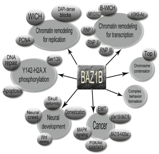 BAZ1B mediates many key chromatin remodeling events as an accessory subunit component of two well-established chromatin remodeling complexes that orchestrate various molecular functions including but not limited to nascent chromatin formation following appropriate DNA replication, facilitating RNA polymerase (I, II and III) activity by providing open chromatin and DNA accessibility, regulating the DNA damage repair response by inducing a specific protein modification on H2AX nucleosomes, and helping the cell to make the decision between life or death. Figure 9 summarizes BAZ1B involvement in the many important cellular functions and other accompanying factors related to BAZ1B functioning (Figure 9). Furthermore, empirical evidence highlighting BAZ1B function in proper neural development conveys probable genotype–phenotype correlations between BAZ1B copy number variation and neurodevelopmental defects found in Williams syndrome patients (single copy) and 7q11.23 duplication syndrome patients (three copies). Recent findings also attribute BAZ1B as playing a central role in maintaining the mitotic chromosome structure as well as involvement in complex traits such as cancer progression and even animal behavior. BAZ1B indeed deserves to be fully understood since considering its profound and decisive roles, it is very probable that this versatile protein is involved in other critical cellular functions that have yet to be discovered.