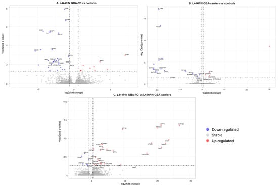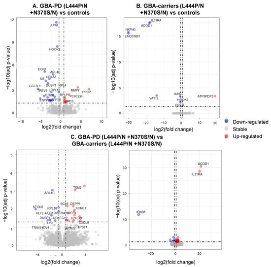 Volcano plot for DEGs between the studied groups (FDR < 0.05 and |FC| > 1.5); the upregulated genes are represented by red dots and the downregulated genes are represented by blue dots. (A). L444P/N GBA-PD patients and controls, (B). L444P/N GBA carriers and controls, (C). L444P/N GBA-PD patients, and L444P/N GBA carriers. (GBA-PD—Parkinson’s disease associated with mutations in the GBA gene; GBA carriers—asymptomatic GBA mutation carriers; DEGs—differentially expressed genes).
